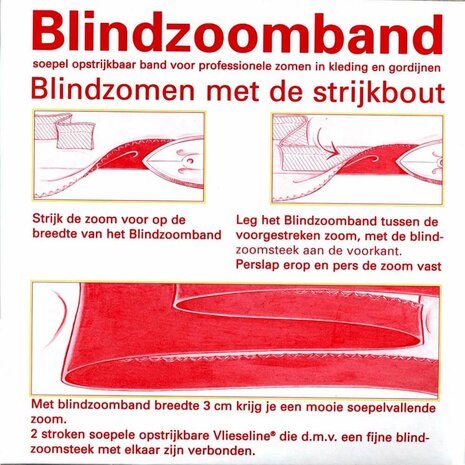 Blindzomen met de strijkbout! Soepel opstrijkbaar band voor professionele zomen in kleding en gordijnen. Strijk de zoom voor op de breedte van de blindzoomband. Leg het blindzoomband tussen de gestreken zoom met de blindzoomsteek aan de voorkant. Perslap erop en pers de zoom vast. Met blindzoomband breedte 3cm krijgt u een mooie soepel vallende zoom. 2 stroken soepele opstrijkbare vlieseline die d.m.v. een blindzoomsteek met elkaar zijn verbonden. Breedte: 30mm Lengte: 5m