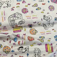 Satijnkatoen met een vrolijke opdruk van bloemen, Volkswagenbusjes, schoenen, tassen, fietsen, boeken en speelse teksten zoals "friends", "smile", "flower" en "dreams". De stof heeft een zachte glans en een soepele valling, perfect voor kinderkleding, accessoires, beddengoed of creatieve naaiprojecten. Wilt u de kamer verduisteren? Dan hebben we daar ook passende gordijnvoering voor!