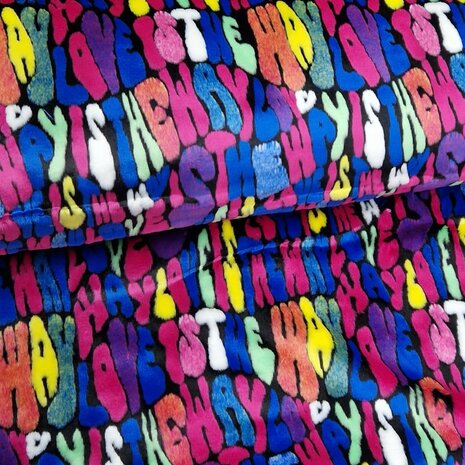 Love is the way! Dit prachtige fake fur van topkwaliteit straalt luxe en speelsheid uit. De bontzachte stof heeft een unieke alfabetprint in levendige kleuren zoals zwart, roze, geel, lime, kobalt en fuchsia. Wat deze stof extra bijzonder maakt, is het reliëfeffect: de letters steken iets uit, waardoor er diepte en een speels 3D-effect ontstaat. Dankzij de hoogwaardige weving en volle vacht voelt deze stof heerlijk zacht aan en valt hij prachtig. Perfect voor een statement jasje, een stijlvol gilet of een opvallende tas – voor uzelf of de kleine! Deze stof is een eyecatcher uit onze modecollectie.