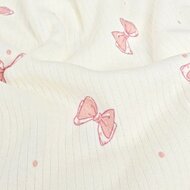 De kleine strikjes geven de stof een lieve en schattige uitstraling, perfect voor het naaien van meisjeskleding zoals jurkjes, shirtjes, leggings en broekjes. Ook voor zachte setjes voor baby’s en items uit de babyuitzet is deze ribtricot een prachtige keuze.