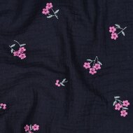 Deze hydrofiele stof heeft een diepe donkerblauwe ondergrond met geborduurde bloemetjes in lila en violet tinten. Het fijne borduursel geeft de stof een speels en elegant detail, terwijl de donkere ondergrond zorgt voor een mooi contrast.
