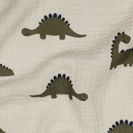 Biologische Hydrofiele Stof met stoere dinoprint is een dubbellaagse stof met als eigenschap ademend, luchtig, soepel, zacht, goed absorberend en natuurlijk huidvriendelijk voor de baby. Vroeger werd hydrofiele stof alleen gebruikt voor luiers. Maar tegenwoordig is de hydrofiele stof in veel items terug te zien waaronder kleding en de babyuitzet. Bijvoorbeeld voor het naaien van een babynestje, baby laken, commodemandjes, aankleedkussenhoes. De structuur van de stof heeft een gekreukelde patroon, super handig, want strijken is dus niet nodig. Andere benamingen voor hydrofiel zijn: mousseline - musselin - muslin - mouseline - tetra - gauze - double gauze Vergeet niet de nodige fournituren te bestellen, zoals bijpassend naaigaren of lockgaren.