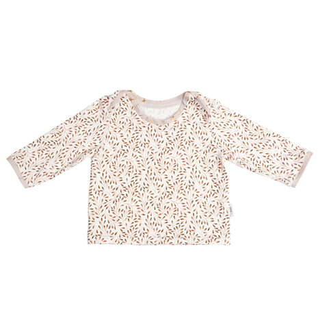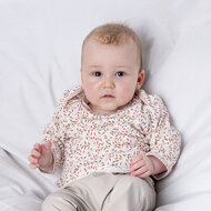 Naaipatroon envelopshirt, inclusief duidelijke werkbeschrijving. Dit t-shirt heeft een overslagsluiting aan de bovenkant waardoor het gemakkelijk over baby’s hoofdje aangetrokken kan worden. Het is gemaakt van zacht babytricot. Voor de hals en de mouwboordjes zijn een contrasterende kleur tricotstof gebruikt. Hiervoor kun je ook tricot biasband gebruiken,