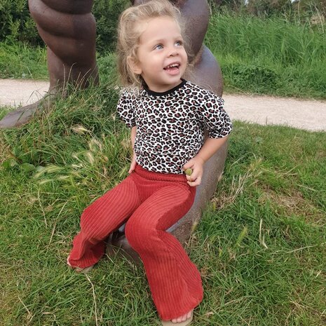 Naaipatroon broekje met flared (wijde) pijpen, inclusief duidelijke werkbeschrijving. Dit leuke broekje heeft ietwat wijde pijpen en is gemaakt van tricotstof. Aan de achterkant is deze voorzien van een achterzakje. De broekband is voorzien van elastiek. Het broekje is door het gemakkelijke patroon in een handomdraai gemaakt. Het naaipatroon van dit flaredbroekje is ook verkrijgbaar voor baby, peuter, kleuter.