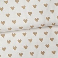 Deze gebreide sweatstof met goudglitter ingeweven harten is een echte must-have! De stof is heerlijk zacht, rekbaar en heeft een prachtige effen gouden achterkant. De gouden lurex prikt niet, waardoor de stof comfortabel draagt. Dankzij de ingeweven glitterharten blijven de details mooi, zonder dat de glitters loslaten.
