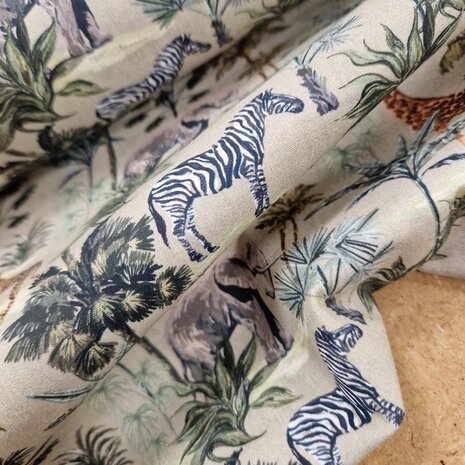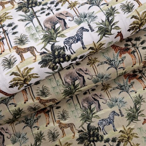 groen grijs camel bruin cognac zwart wit olifant zebra giraf panter Jungle dieren digitaal katoen (op=op)