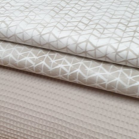 kiezel met wit geometrische lijnen kiezelgeometrische lijnen en kiezel wafel @leukefrutsels knuffelkonijnen van teddy katoen - geolijnen kiezel - roze bosdiertjes - eucalyptustakjes katoentjes wafel taupe 414012 met geometische katoen KicKenStoffen varen blaadjes kiezel en oud roze licht met off white wafel en off white eucalyptus viscose uni beige (kiezel) met wit geometrische lijnen poplin katoen