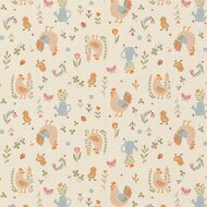 Swessie katoen met boerderij- en bloemenprint is een vrolijke en speelse stof op een lichte ondergrond. In de print ziet u kipjes, kleine diertjes en gietertjes, gecombineerd met fijne bloemetjes en takjes.