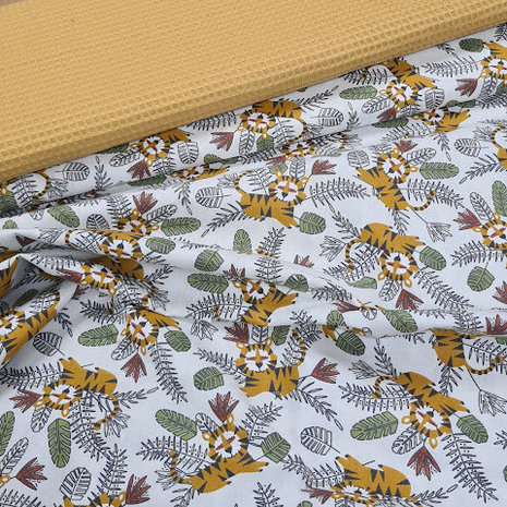 jungle tijger tricot Swessie bladeren wit (natural) camel oker terracotta groen zwart leeuwen tijger en palmbladeren jungle - tricot wafel jersey met gouden blaadjes digitale tricot BEEBS wit (natural) camel oker terracotta groen zwart leeuwen tijger en palmbladeren jungle - tricot tijgers bladeren SWESSIE wit (natural) camel oker terracotta groen zwart leeuwen tijger en palmbladeren jungle - tricot