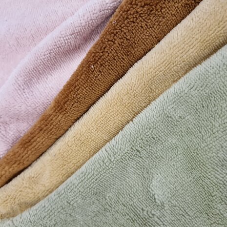 Deze heerlijk zachte en warme stof is een waardevolle toevoeging aan onze collectie. De bamboe-katoenen fleece is verkrijgbaar in diverse kleuren en heeft een bijzondere afwerking: de ene zijde heeft een zachte fleece-/veloursstructuur, terwijl de andere kant een bijpassende (baby)badstofachtige uitstraling heeft.