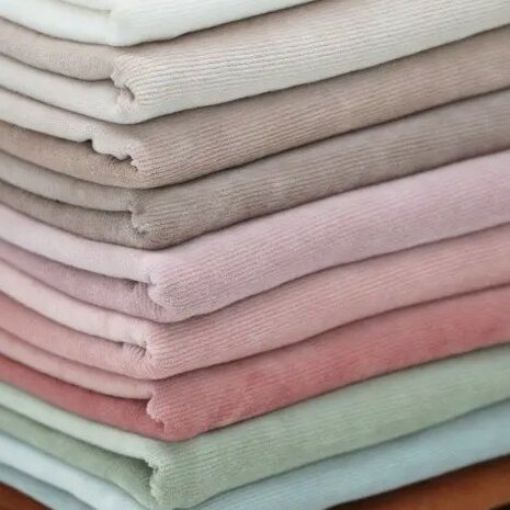Onze smalle ribfluweel jersey stof is ideaal voor het maken van schattige en comfortabele babykleding of voor de babyuitzet. Deze stof combineert een luxueuze uitstraling met een heerlijk zachte touch, perfect voor de gevoelige huid van jouw kleintje.