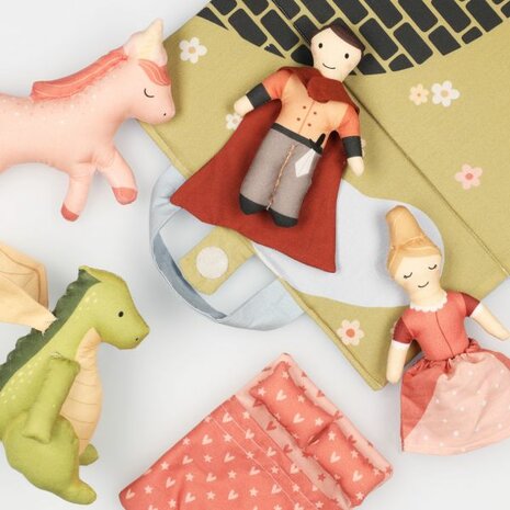 Prins, prinses en kasteel poppenhuis set met losse kleding en een draak en eenhoorn knutselpakket.