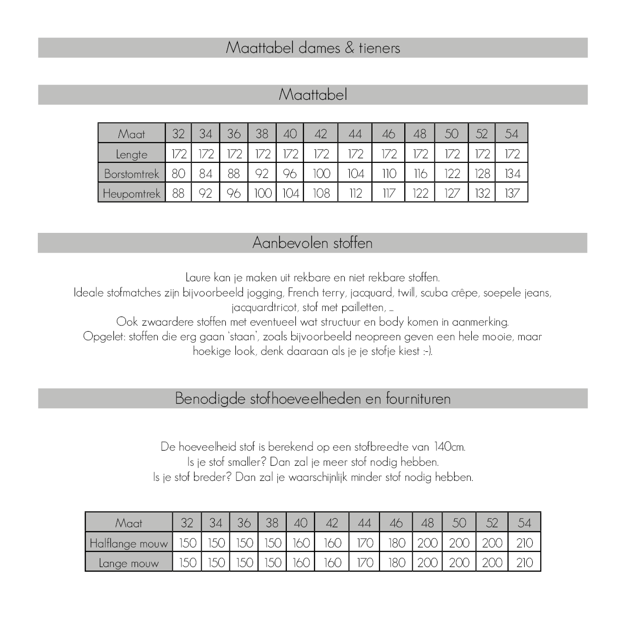 -het patroon afgedrukt op 2 A0 pagina’s in de maten 32, 34, 36, 38, 40, 42, 44, 46, 48, 50, 52 en 54 + kids 92-164