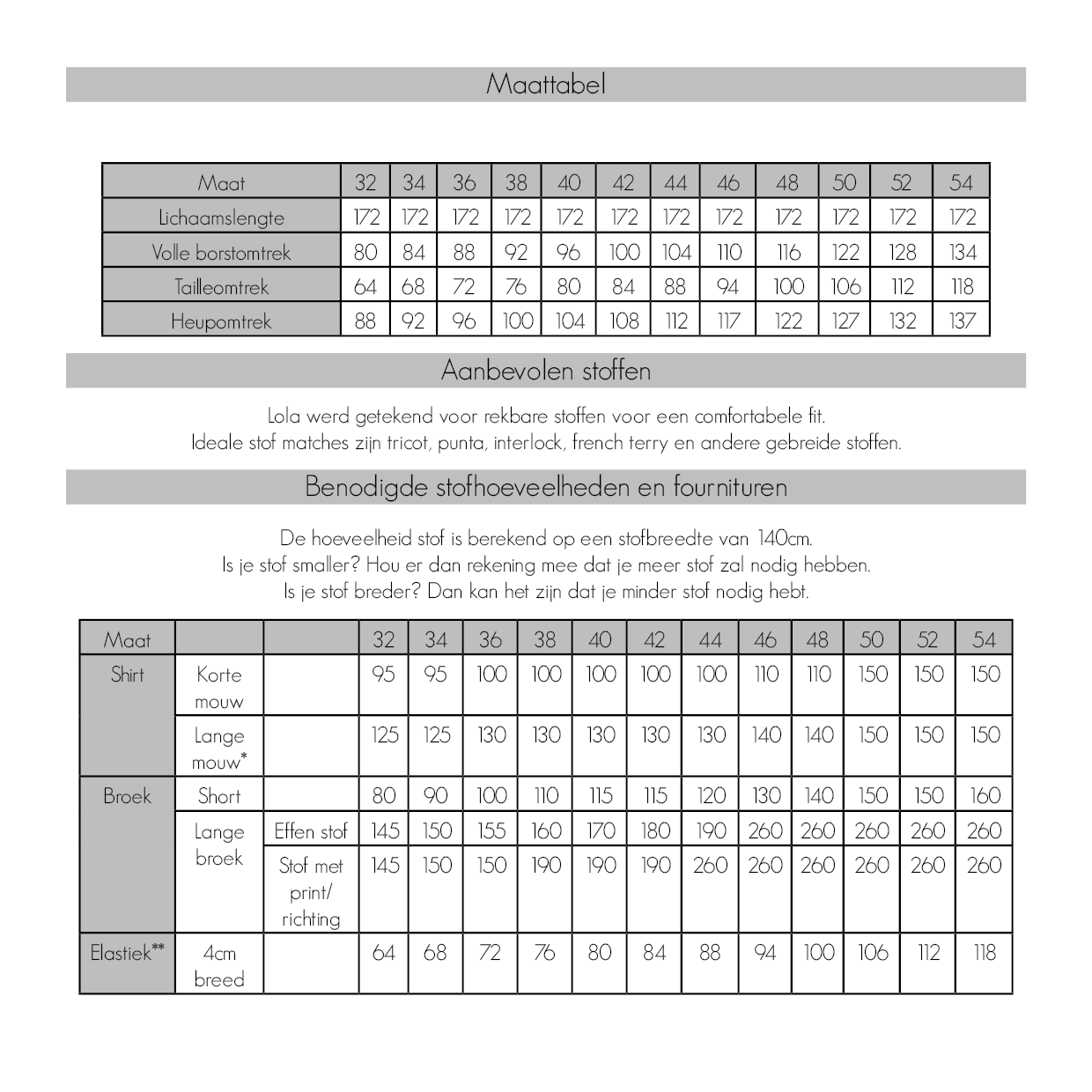 Ideale stofmatches zijn bijvoorbeeld tricot, punta di milano, jogging, French terry, kabel jacquardribfluweel tricot, stof met pailletten,.. en andere gebreide stoffen.