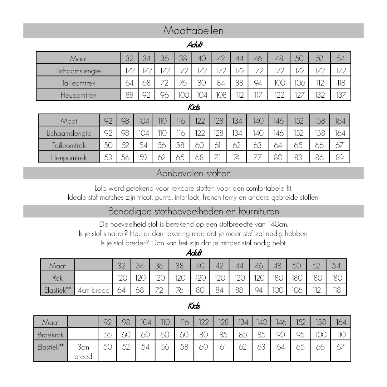 1. Je krijgt het digitale Lola patroon voor kids in maatjes 92 tot 164, dit staat bij op je patroon geprint.