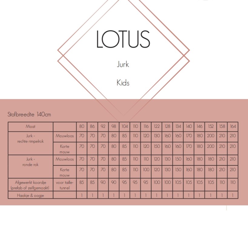 Lotus is een speelse jurk, voor kleine en grote meisjes, die sluit met haakje en oogje bij de split achteraan.