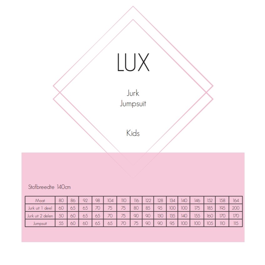 Het Lux naaipatroon voor meisjes is een patroon voor een unieke jurk of een toffe jumpsuit in de maten 80 tot en met 164. Bij de voorbeelden zowel de optie voor smok elastiek als zichtbaar sier elastiek.