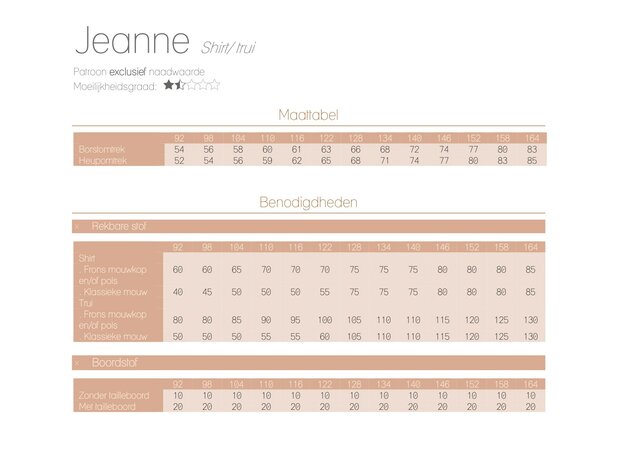 Het patroon is voorzien van een uitgebreide tutorial, die je stap voor stap door het maakproces van de Jeanne zal leiden. Hierdoor is het patroon zowel geschikt voor beginnende naai(st)ers als voor meer ervaren naai(st)ers.