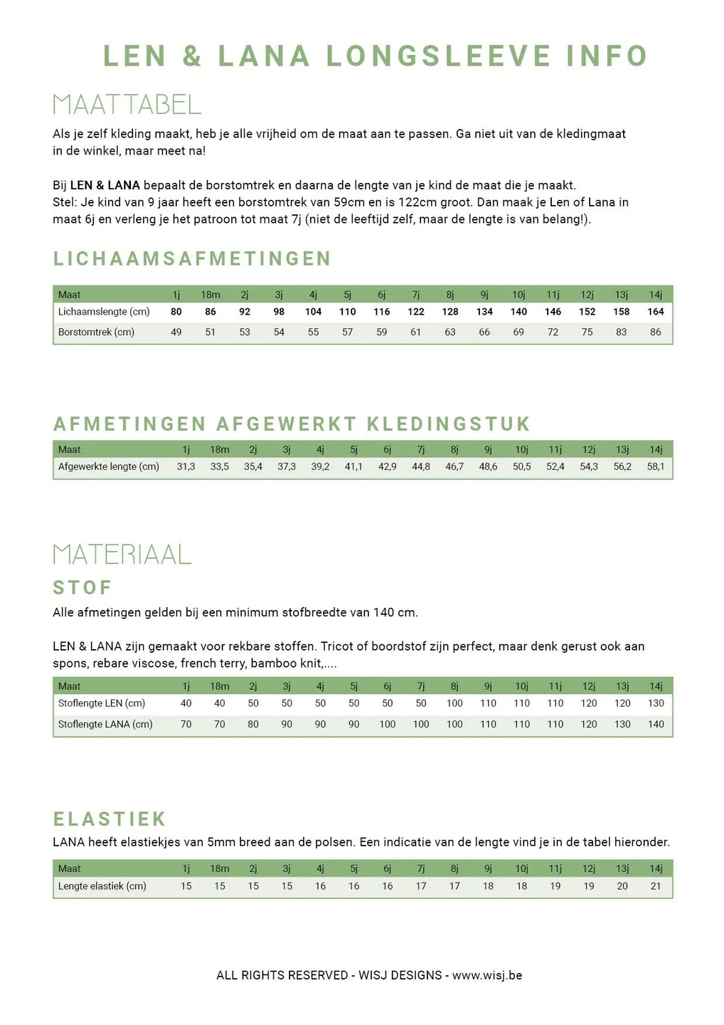 Len & Lana is een patroontje voor een longsleeve in maten 1-14 jaar, maar wel in twee verschillende versies. Len is een heel basic aansluitend T-shirt met lange mouwen. Lana is een wat meer dramatische versie van Len met brede pofmouwen en elastiekjes aan de polsen. Het patroon is heel geschikt voor rekbare stoffen zoals tricot en boordstof, maar het kan even goed uit french terry, bamboo knit of rekbare viscose gemaakt worden.