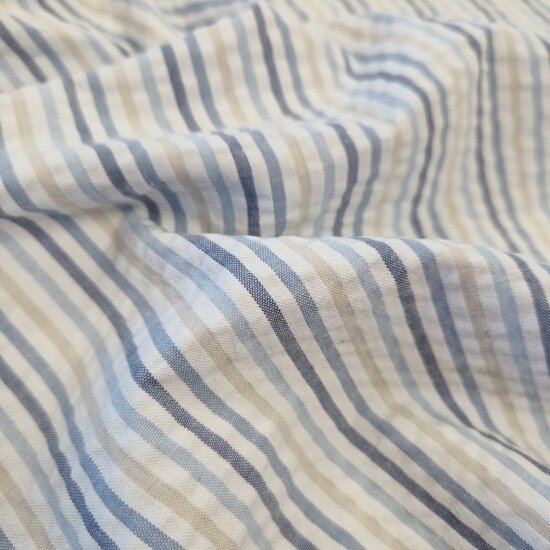 Deze seersucker katoen met een subtiel streepjespatroon is ideaal voor het maken van luchtige en comfortabele kleding, zoals blouses, jurken of kinderkleding. De crêpeachtige structuur van de stof zorgt voor een fijne, ademende draagervaring, perfect voor warmer weer. De stof is met gekleurde garen geweven, waardoor de streepjes aan zowel de voor- als achterkant mooi zichtbaar zijn en de kleuren niet vervagen, zelfs na meerdere wasbeurten.
