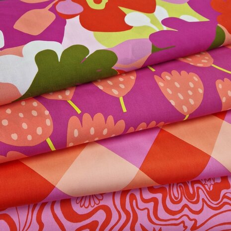 Deze stof is gemaakt van Lenzing™ EcoVero™ en heeft een prachtige warme kleuren met een Trial Run print. Met een Oeko-Tex certificering is deze stof niet alleen milieuvriendelijk, maar ook vrij van schadelijke stoffen. De luchtige kwaliteit maakt het ideaal voor het creëren van comfortabele en elegante kleding. Deze stof is uit onze Fuchsia Fizz Nerida Hansen collectie. Maak een statement met deze duurzame en verfijnde stof!