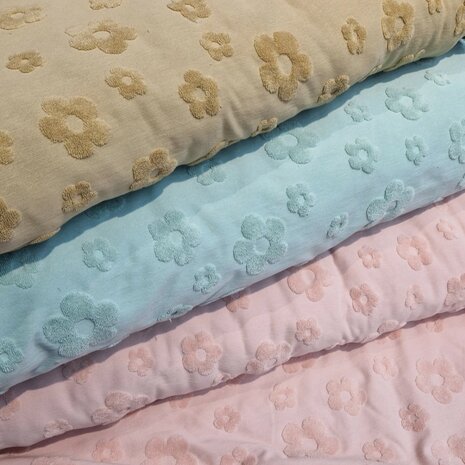 Deze zachte badstoftricot met een subtiel bloemenmotief is perfect voor comfortabele en stijlvolle creaties. Dankzij de jacquardstructuur en hoogwaardige katoenmix voelt de stof heerlijk aan en is deze ideaal voor babykleding, loungewear of accessoires. Combineer praktisch met mooi en geniet van de luxe uitstraling van dit veelzijdige materiaal.