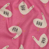 Deze biologische ribstof is ontworpen door Jennifer Bouron en heeft een fijne smalle ribstructuur. De stof heeft een mooie roze ondergrond met speelse illustraties van vogels, die doen denken aan ganzen, kipjes of eendjes.
