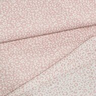 Deze zachte hydrofiele stof is geweven met een subtiele luipaardprint (jacquard), wat betekent dat het patroon ín de stof is verwerkt in plaats van erop gedrukt. De stof is dubbelzijdig te gebruiken: de ene kant heeft een lichte ondergrond, de andere kant een donkere.
