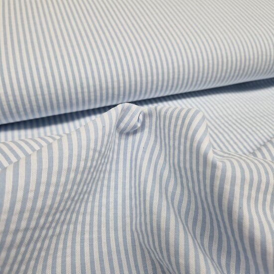 Deze seersucker katoen met een subtiel streepjespatroon is ideaal voor het maken van luchtige en comfortabele kleding, zoals blouses, jurken of kinderkleding. De crêpeachtige structuur van de stof zorgt voor een fijne, ademende draagervaring, perfect voor warmer weer. De stof is met gekleurde garen geweven, waardoor de streepjes aan zowel de voor- als achterkant mooi zichtbaar zijn en de kleuren niet vervagen, zelfs na meerdere wasbeurten.