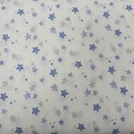Deze katoenen stof heeft een mooie sterrenprint in verschillende groottes, uitgevoerd in rustige blauw- en grijstinten. Een tijdloos en zacht dessin dat perfect past in zowel baby- als kinderkamers.