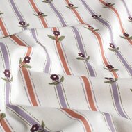 Deze katoenen stof met warme off white ondergrond heeft een zachte en romantische uitstraling. De verticale strepen in claypink en lila worden speels gecombineerd met fijne bloemetjes in een mauve/paarsige tint. Samen zorgt dit voor een rustig en verfijnd geheel met een subtiele cottage core uitstraling.