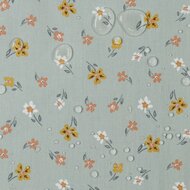 Deze stof is 100% katoen met 2laagse acryl coating, dit zorgt voor een water- en vuilafstotende laag. De stof is bedrukt met een vrolijke bloemetjes print.