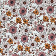 Op zoek naar een romantische blikvanger met een vleugje retro? Deze digitale tricot met grote madeliefachtige bloemen in warme tinten roze, terracotta, dusty oranje en lichtroze op een offwhite ondergrond straalt pure zachtheid én stijl uit.