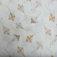 Deze katoenen stof heeft een speelse print met vliegers in warme beige- en cameltinten. Een rustig en tegelijk uniek dessin dat je niet overal tegenkomt en perfect past in een moderne baby- of kinderkamer.