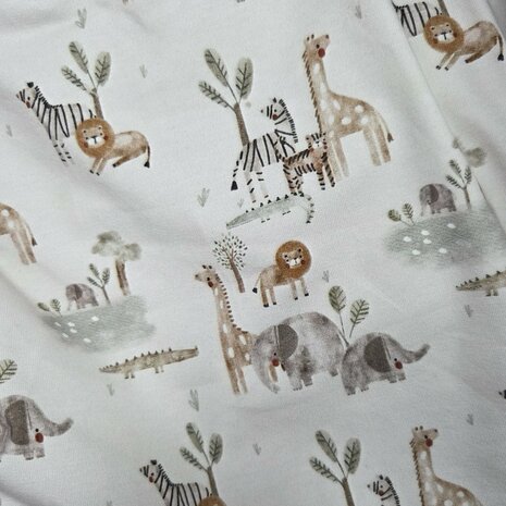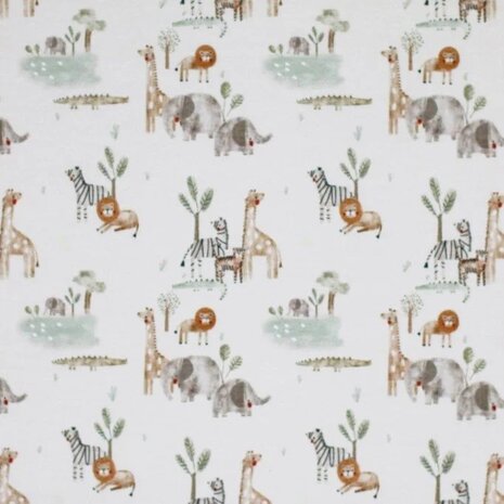 BEEBS tricot – Wildlife dieren Heerlijk zachte en soepel vallende tricot met mooie dierenprint van jungle dieren. Deze single jersey is licht rekbaar (in twee richtingen) en blijft mooi in vorm dankzij een vleugje elastan – ideaal voor baby- en kinderkleding of bijvoorbeeld een slaaptunnel.