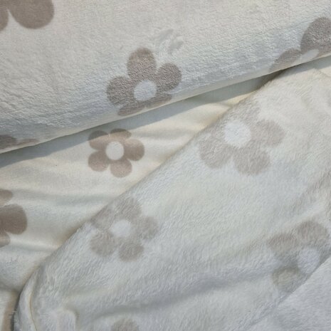Zachter dan zacht: Knuffel Fleece Onze Knuffel fleece, ook wel bekend als Wellness fleece, is een droom van zachtheid. Deze stof heeft een luxe uitstraling met een prachtige kant waarop grote bloemen staan en een andere kant met een subtielere, lichtere versie van hetzelfde design.