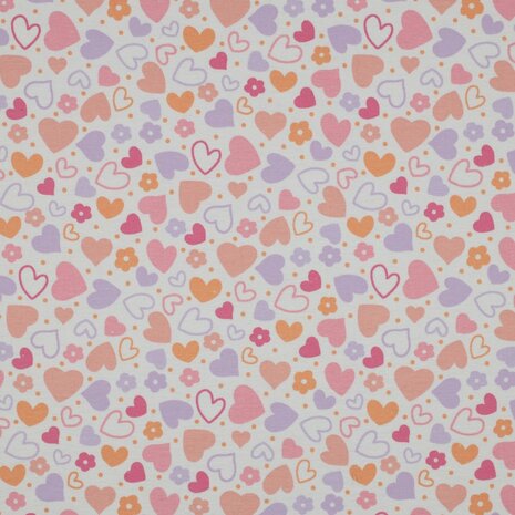 Deze stof is gemaakt van 100% katoen en voelt heerlijk zacht aan. Eén zijde is licht geruwd, wat zorgt voor extra comfort, en de stof is prachtig bedrukt met hartjes.