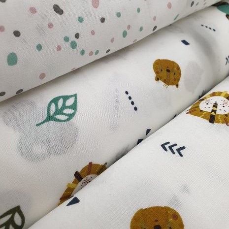 wit oker groen leeuw olifant tijger jungle diertjes met bladeren poplin katoen